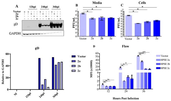Overexpression of HPSE 2 leads to lower viral replication (A). Representative Western blot of expression of viral protein gD after overexpression of HPSE 2 (upper panel). The quantified protein levels of gD are plotted, indicating decreased gD protein levels when isoforms are expressed compared to vector control (lower panel). VK2 cells were infected with HSV-2 333 24 h after transfection with plasmids overexpressing HPSE 2 a, b, and c and a control. Samples were collected at 0 for the control and 12, 24, and 48 h post-infection for all categories. (B). Quantification of plaque assay of media collected from cells that were overexpressing HPSE 2 a, b, and c and then were infected with HSV-2 at an MOI of 1. Samples were collected at 24 h post-infection. (C). Quantification of plaque assay of cell lysates collected from cells that were overexpressing HPSE 2 a, b, and c and then were infected with HSV-2 at an MOI of 1. Samples were collected at 24 h post-infection. (D). Quantification of infection after overexpressing HPSE 2 a, b, and c flow cytometry experiments, with samples collected 12, 24, and 36 h post-infection. All plotted results are presented as mean ± SEM of three independent experiments (n = 3). Asterisks denote a significant difference as determined by Student’s t-test; (* p < 0.05, ** p < 0.01, *** p < 0.001, NS: not significant).