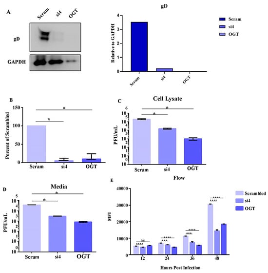 Our investigation so far has demonstrated that HSV-2 infection leads to an increase in HPSE 2 levels, and that the overexpression of HPSE 2 has a detrimental effect on HSV-2 replication. To further explore the influence of reduced HPSE 2 levels on viral proliferation, we designed a small interfering RNA (siRNA)-mediated knockdown of HPSE 2. We synthesized four siRNAs targeting HPSE 2, named si1, si2, si3, and si4, along with a scrambled siRNA as a control. A Western blot analysis identified si4 as the most effective in reducing HPSE 2 protein levels (data not included). Following HPSE 2 knockdown with si4, VK2 cells were infected with HSV-2 strain 333 at an MOI of 0.1. Additionally, control cells treated with either scrambled siRNA (for 12 h as per the manufacturer’s protocol) or cells exposed to the HPSE inhibitor OGT 2115 (at two hpi) for a total of 12 h were used. We first assessed the levels of the abundant viral protein glycoprotein D (gD) using a Western blot analysis. To our surprise, the results showed a significant decrease in gD production in both HPSE 2 knockdown and OGT 2115-treated cells compared to cells treated with scrambled siRNA (Figure 3A). The quantification of the Western blot data confirmed a significant reduction in gD expression in HPSE 2 knockdown and OGT 2115-treated cells (Figure 3B), which was unexpected given that the overexpression of HPSE 2 previously had inhibited HSV-2 infection.