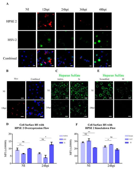 Mechanism of HPSE 2 inhibition of HSV-2 infection. (A). Representative immunofluorescent microscopy images of HPSE 2 surface stain. HSV-2 333 GFP was used to infect cells at an MOI of 0.1, then images were taken 0, 12, 24, 36, and 48 h post-infection. The top row is HPSE 2 in red, the middle row is HSV-2 in GFP, and the last row includes Hoechst in blue, HPSE 2 stain in red, and HSV-2 in green. (B). Representative immunofluorescent images of surface HPSE 2c-myc stain. HSV-2 333 was used to infect cells at an MOI of 1 for 12 h. Upper left is myc stain only in uninfected sample, upper right is Hoescht and myc stain merged for uninfected sample, lower left is myc stain only for infected sample 12 h post-infection, and lower right is Hoechst and myc stain merged for infected sample 24 h post-infection. (C). Representative immunofluorescent images of surface heparan sulfate stain. HSV-2 333 was used to infect cells at an MOI of 1 for 24 h. Left column shows control cells, with uninfected cells on top and infected cells on the bottom. Right column shows cells overexpressing HPSE 2c, with uninfected cells on top and infected cells on the bottom. (D). Quantification of cell surface heparan sulfate flow cytometry experiments by flow with cells overexpressing HPSE 2. (E). Representative immunofluorescent images of surface heparan sulfate stain. HSV-2 333 was used to infect cells at an MOI of 1 for 24 h. Left column shows control cells, with uninfected cells on top and infected cells on the bottom. Right column shows cells with HPSE 2c knockdown, with uninfected cells on top and infected cells on the bottom. (F). Quantification of cell surface heparan sulfate flow cytometry experiments used cells with HPSE 2 knockdown. Scale bar, 40 μm. All plotted results are presented as mean ± SEM of three independent experiments (n = 3). Asterisks denote a significant difference as determined by Student’s t-test; (* p < 0.05, ** p < 0.01, NS: not significant).