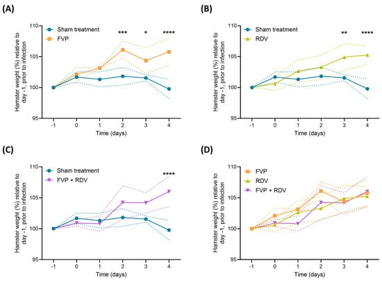 Percentage weight change of each treatment group throughout the entire study duration. Hamsters in each treatment group (n = 4) were weighed every day from day −1 to day 4. Weights are represented as a percentage of the initial weight measured at the beginning of the study, on day −1. (A) Sham treatment vs FVP, (B) sham treatment vs RDV, (C) sham treatment vs FVP + RDV, and (D) FVP vs. RDV vs. FVP + RDV. Two-way ANOVA multiple comparison with Bonferroni correction was used to determine statistical significance. * = p ≤ 0.05, ** = p ≤ 0.01, *** = p ≤ 0.001, **** = p ≤ 0.0001. Dotted lines represent standard deviations.