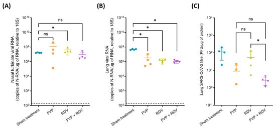 Viral quantification (N-RNA) and lung viral titres (PFU/µg of protein) of SARS-CoV-2 from samples of each treatment group (n = 4) at day 4. (A) Nasal turbinate and (B) lung copies of viral N-RNA/µg of RNA, relative to 18S, from each treatment group. Statistical significance between the sham treatment group and treated groups was determined using a nonparametric Mann–Whitney test (one-tailed, p ≤ 0.05). (C) Sham treatment group samples were processed separately from the treatment groups (hence no statistical comparison could be performed). Statistical significance between the different treatment groups (FVP vs. RDV, FVP vs. FVP + RDV, and RDV vs. FVP + RDV) was determined using a nonparametric Mann–Whitney test (one-tailed, p ≤ 0.05). Lung viral titres from the FVP + RDV combination group were lower in comparison to the FVP and RDV monotherapy groups but only significantly different from the latter. ns = not statistically significant, * = p ≤ 0.05. LOD: limit of detection (indicated by dotted line).