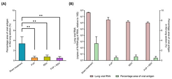 A morphometric analysis served to quantify and compare the extent of SARS-CoV-2 NP expression in the left lung (the right lung had served for viral RNA quantification and plaque assay) as a further means to compare the extent of viral infection in the different groups. As shown in Figure 3A, the percentage area of viral antigen immunolabelling in relation to the total area in the lung sections was significantly higher (3.40% on average) in the sham treatment group than in the FVP group (0.58%; p = 0.0004), the RDV group (0.76%; p = 0.0007), and the FVP + RDV combination group (0.51%; p = 0.0003) but did not differ significantly between the monotherapy and combination groups (Table S4). As seen in Figure 3B, the SARS-CoV-2 N-RNA levels and the extent of viral antigen expression in the lung were positively correlated.