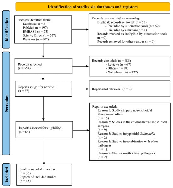 In this systematic review, we identified the pertinent literature on the application of phages to detect NTS in all food sample types. To accomplish this, we commenced with keyword searches across scientific research records and databases, as shown in Supplementary Tables S1–S3. These searches yielded a comprehensive pool of 607 records sourced from the prominent platforms PubMed/MEDLINE, Embase, and ScienceDirect, with 197, 73, and 337 records, respectively. Subsequently, 35 English-language documents were meticulously handpicked for in-depth scrutiny by a panel of three independent reviewers based on our inclusion and exclusion criteria as stated above (Figure 1). To ensure rigor and consensus in the selection process, a fourth reviewer was engaged as an arbiter in cases of discordance.
