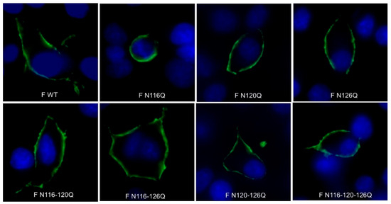Plasmids containing the full-length F protein with single, double and triple mutations of N-glycosylation sites N116, N120 and N126 were transfected into BSR T7/5 cells. The RSV F surface expression was evaluated via confocal microscopy, and the F WT was used as a control. The results show that all F p27 glycomutants were expressed on the cell surface, suggesting no major issues with protein conformation or processing. Representative images of the immunofluorescence cell surface staining are shown in Figure 1.