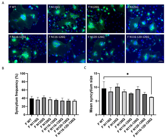 Fusion assay assessing the effect of loss of RSV F p27 N-glycans on syncytium formation. (A) Fluorescent images of the respective F p27 glycomutants. Nuclei were stained with DAPI (blue) and RSV F proteins were stained with palivizumab and secondary goat anti-human IgG AF488 (green) (scale bar = 50 µm). (B) Syncytium frequency. (C) Mean syncytium size. Data represent the mean ± SD of three independent repeats. * p < 0.05. (one-way ANOVA).