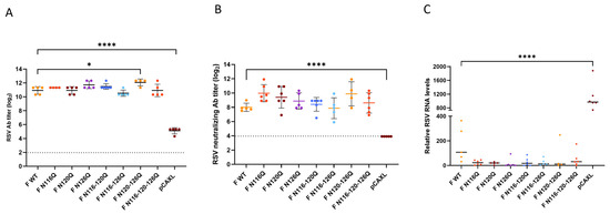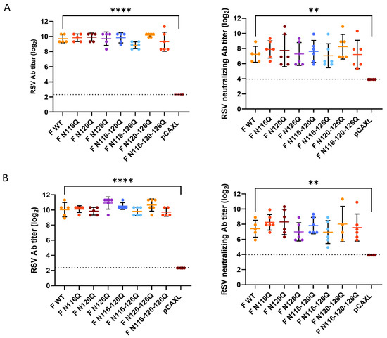 Next, the neutralizing antibody titers were determined five days post challenge (Figure 4B). Significantly higher neutralizing antibody titers were observed for all F p27 glycomutants compared with the empty plasmid pCAXL. In general, all RSV F p27 glycomutants induced serum-neutralizing antibody responses at least as high as those of the F WT. However, none of the mutants induced neutralizing antibody titers which were significantly higher than those elicited by the F WT.