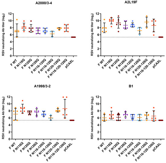 Similarly, for all RSV A strains tested (A2L19F, A2000/3-4 and A1998/3-2), no significant differences in the neutralizing antibody titers were observed for any RSV F p27 glycomutants compared with the RSV F WT.