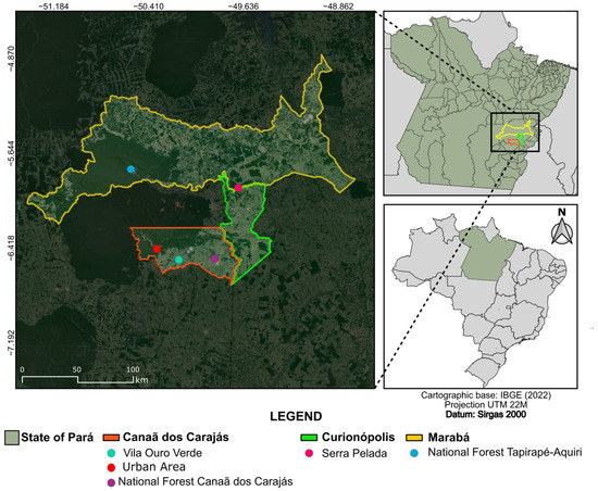 This study was conducted in the localities of Vila Ouro Verde (S 06°31′38.2″; W 50°08″52.5″), an urban area (S 06°31′08.1″; W 49°51′18.8″), and Carajás National Forest (S 06°26′24.8″; W 50°19′37.2″), all located in the municipality of Canaã dos Carajás; Serra Pelada (S 05°56′35.3″; W 049°40′38.7″) in the municipality of Curionópolis; and Tapirapé-Aquiri National Forest (S 05°46′16.4″; W 50°33′15.8″) in the municipality of Marabá, in the state of Pará, in the Amazonia region, Brazil (Figure 1). These municipalities are within the area of influence of the Carajás mining complex. The activities were authorized by the Chico Mendes Institute for Biodiversity Conservation (ICMBIO), under authorization numbers 021-2018 and 57-2019.