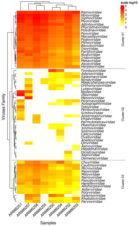 In cluster 1, a higher number of reads was observed for all pools, with the families Retroviridae, Mimiviridae, Siphoviridae, Myoviridae, and Adintoviridae presenting the highest numbers of reads. In contrast, cluster 3 showed a lower number of reads for almost all pools, except for the families Solemoviridae, Rhabdoviridae, and Parvoviridae, which had no reads in pools AR886251 and AR886255, and the family Solemoviridae, which had no reads in pool AR886252.