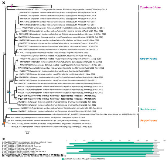 Phylogenetic inferences were performed using the amino acid sequence of the RdRp region from the two recovered strains of Ouro verde tombus-like virus 1, representatives of the family Tombusviridae and the Gopeviruses, Suriviruses, and Aspoviruses clades. The analyses showed that the two recovered genomes are not classified in any of the genera of the family Tombusviridae but formed a monophyletic clade related to viruses classified in the Gopeviruses clade (Figure 3a).