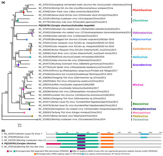 Phylogenetic relationship and genomic organization of Carajas chuvirus. (a) Phylogenetic inference was performed using the Maximum Likelihood (ML) method based on the amino acid sequences of the RNA-dependent RNA Polymerase (RdRp) protein, using the LG+F+R6 matrix as the best nucleotide substitution model, and measurement of the phylogenetic signal in the dataset, showing only 11.8% unresolved quartets and 88.2% resolved quartets. The genera are identified by different colors on the right side of the tree. The samples identified in this study are highlighted in bold. The numbers at each main node of the tree correspond to bootstrap values in percentages (1000 replicates). The scale bar corresponds to amino acid divergence per site between sequences. (b) Domains are displayed as colored boxes, and the sequence size is shown as the number of nucleotides.