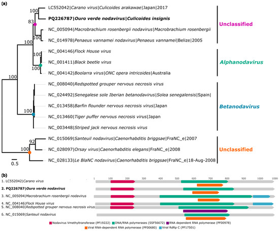 Phylogenetic relationship and genomic organization of Ouro Verde nodavirus. (a) Phylogenetic inference was performed using the Maximum Likelihood (ML) method based on the amino acid sequences of the RNA-dependent RNA Polymerase (RdRp) protein, using the LG+F+I+G4 matrix as the best nucleotide substitution model, and measurement of the phylogenetic signal in the dataset, showing only 11.4% unresolved quartets and 88.6% resolved quartets. The genera are identified by different colors on the right side of the tree. The samples identified in this study are highlighted in bold. The numbers at each main node of the tree correspond to bootstrap values in percentages (1000 replicates). The scale bar corresponds to amino acid divergence per site between sequences. (b) Domains are displayed as colored boxes, and the sequence size is shown as the number of nucleotides.