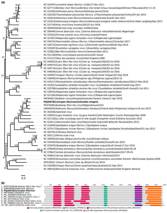 Phylogenetic relationship and genomic organization of Carajas iflavirus. (a) Phylogenetic inference was performed using the Maximum Likelihood (ML) method based on the amino acid sequences of the polyprotein, using the VT+F+R7 matrix as the best nucleotide substitution model, and measurement of the phylogenetic signal in the dataset, showing only 18% unresolved quartets and 82% resolved quartets. The sample identified in this study is highlighted in bold. The numbers at each main node of the tree correspond to bootstrap values in percentages (1000 replicates). The scale bar corresponds to amino acid divergence per site between sequences. (b) Domains are displayed as colored boxes, and the sequence size is shown as the number of nucleotides.