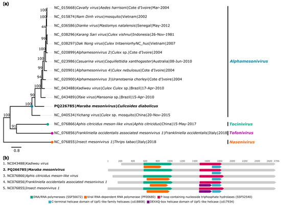 Phylogenetic relationship and genomic organization of Maraba mesonivirus. (a) Phylogenetic inference was performed using the Maximum Likelihood (ML) method based on the amino acid sequences of polyprotein 1a, using the LG+F+R5 matrix as the best amino acid substitution model, and measurement of the phylogenetic signal in the dataset, showing only 8.2% unresolved quartets and 91.8% resolved quartets. The genera are identified by different colors on the right side of the tree. The sample identified in this study is highlighted in bold. The numbers at each main node of the tree correspond to bootstrap values in percentages (1000 replicates). The scale bar corresponds to amino acid divergence per site between sequences. (b) Domains are displayed as colored boxes, and the sequence size is shown as the number of nucleotides.