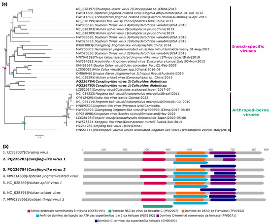 The amino acid sequences of the ORF corresponding to the NSP2 protein of the two sequences were aligned to a dataset of 29 sequences from viruses of the Jingmenvirus group, including arboviruses and arthropod-specific viruses. The monophyletic analysis showed that the obtained sequences formed a monophyletic clade with Carajing virus, with this clade being the most basal in the large clade of Jingmenviruses exclusively associated with arthropods (Figure 8a).
