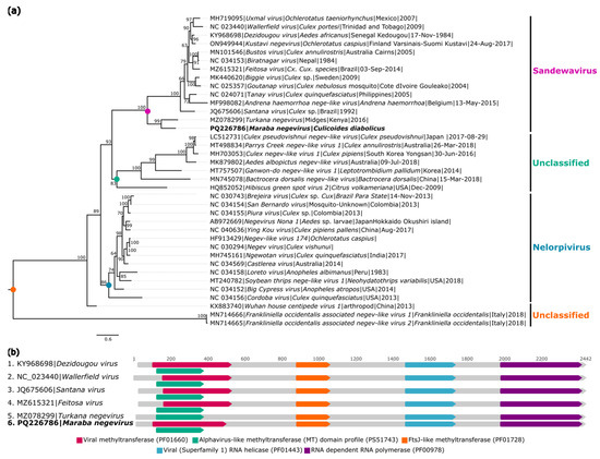 The amino acid sequences corresponding to the domain of hypothetical protein 1 were aligned with 36 negevirus sequences to determine the phylogenetic relationships (Figure 9a). The analyses showed that Maraba negevirus is grouped with Turkana negevirus in a more basal subclade of viruses called Sandewavirus. The same protein domains present in other negevirus genomes were identified (Figure 9b).