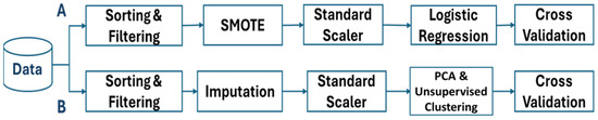 In our data processing workflow, we adopt two distinct paths, each tailored for specific modeling approaches: Method A for Gradient Boosted Decision Trees and Method B for Deep Learning Neural Networks. Method A follows standard steps such as data loading, cleaning, converting columns to float types, and handling missing values by removing rows with NaNs. Class imbalances are addressed using SMOTE oversampling [28], followed by constructing a pipeline that leverages logistic regression for model building and evaluation.
