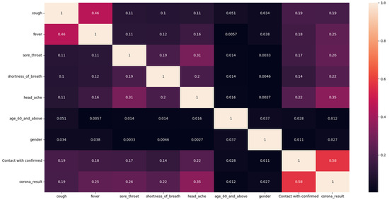 Correlation analysis plot of COVID-19 dataset. The first five features represent reported symptoms, while the other features include demographics like age and gender. “Contact with confirmed” indicates whether an individual had contact with someone confirmed to have COVID-19. Correlation values near +1 indicate strong positive relationships, while values near −1 indicate strong negative relationships.
