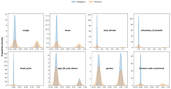 Probability Density Function (PDF) analysis of COVID-19 features in relation to the label. The plots compare the probability density of different COVID-19 features, such as symptoms and demographic factors, in relation to PCR test results (negative or positive). The blue curves represent individuals with negative PCR test results, while the orange curves represent those with positive results. Each subplot highlights the distribution of a specific feature (e.g., cough, fever, age) between the two groups, showing differences in symptom presence and other characteristics among those who tested positive or negative for COVID-19.