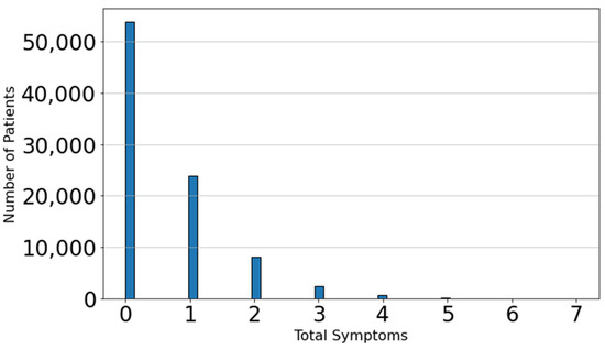 The fact that most patients did not exhibit any symptoms (Figure 4) suggests that these individuals either did not have COVID-19 or were in the early stages of the disease. Conversely, a smaller subset of patients presented with at least one symptom, with the highest number of symptoms reported by a single patient being seven. To gain deeper insights into the subset of patients with active symptoms, we focused on these patients and analyzed which symptoms were most frequently present.