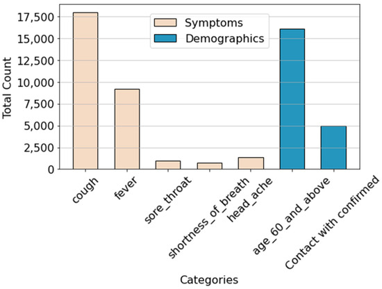 When looking into the PDF analysis in relation to the label, the y-axis represents the density probability of each feature, while the x-axis denotes the COVID PCR result, where a value of 1 indicates a positive PCR result (presence of COVID infection), and 0 indicates the absence of infection. It is evident that most features are associated with a low probability of identifying a positive label, suggesting these features may act as protective factors or negative predictors for COVID-19. These factors significantly reduce the likelihood of an individual having the infection. Exceptions include gender, where a value of 1 indicates female, and age above 60, which shows a high probability of both positive and negative COVID results. Three features, sore throat, shortness of breath, and headache, exhibited very low probability densities when their value was 1 and the label was positive. This indicates that it is rare for these features to have a value of 1 when the label is positive, leading us to consider these features as potential outliers. Outliers are data points that significantly deviate from the rest of the observations. In this case, these features deviate from the typical pattern observed in the dataset, making them notable as unusual instances. To further examine the relationship between each feature and the label, we analyzed the count and percentages of values associated with the label for each feature (Figure 3).