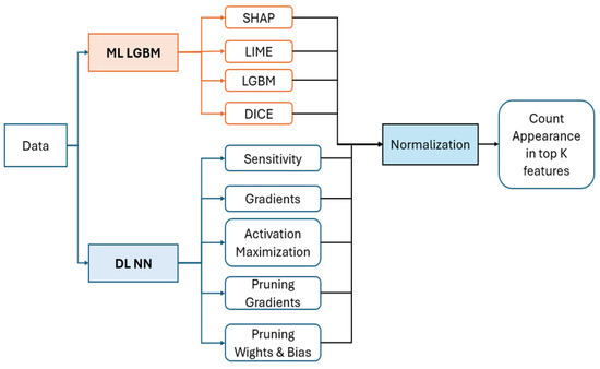 We employed a comprehensive approach involving multiple processes of data filtration and sorting through several pipelines. We began by carefully analyzing the dataset characteristics before developing two predictive classifiers: one using gradient boosting decision trees (GBDT) techniques and the other employing deep learning neural network architecture, both incorporating state-of-the-art methodologies. After constructing and validating these classifiers, we established a pipeline to compare advanced feature importance techniques from both global and local interpretation methods. These techniques included SHapley Additive exPlanations (SHAP) [10,23,24], LIME [12], Diverse Counterfactual Explanations (DiCE) [25,26], LightGBM (LGBM) [27,28], gradients [29], activation maximization [30], and sensitivity permutation [31], among others. This pipeline was crucial in identifying the top K important features across all nine methods, providing a holistic understanding of our model development and evaluation process. Integrating these advanced techniques allowed us to gain deep insights into the models’ inner workings and the key factors driving their predictive power.