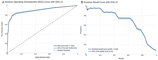 The model’s performance on the test set was evaluated using the area under the receiver operating characteristic curve (auROC). Additionally, precision–recall curves, which depict positive predictive value (PPV) versus sensitivity, were plotted across various thresholds. Metrics including sensitivity, specificity, PPV, negative predictive value, false-positive rate, false-negative rate, false discovery rate, and overall accuracy were computed for all thresholds from the ROC curves. To estimate the uncertainty around these performance measures, confidence intervals (CI) were derived using the bootstrap percentile method with 5000 repetitions [30,40]. This resampling technique provides a robust means of assessing the model’s performance across a range of thresholds, offering valuable insights into its predictive capabilities.