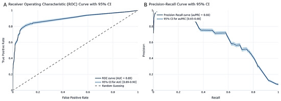 In the prediction test, our DL model showcased robust predictive capabilities, yielding an auROC (area under the receiver operating characteristic curve) of 0.89, with a 95% confidence interval (CI) ranging from 0.89 to 0.90 (Figure 8A). This score underscores the model’s proficiency in effectively distinguishing between classes. Additionally, the model achieved an auPRC (Area Under the Precision–Recall Curve) of 0.66, with a 95% CI spanning from 0.65 to 0.68 (Figure 8B), emphasizing its precision and ability to uphold a high positive predictive value (PPV) across diverse thresholds. These results are indicative of the model’s superior performance when compared to the established baseline, as evidenced by the enhanced accuracy metrics and their respective confidence intervals, as detailed in the accompanying Table 5 below. To ensure robustness, the confidence intervals were validated using bootstrapping, further reinforcing the reliability of the model’s performance, as can be seen in the Supplementary Material (Table S2).