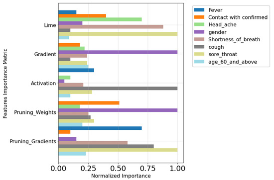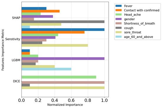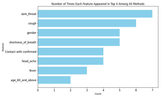 Further analysis of the models revealed that “Sore Throat” appeared five times among the top four features across all local interpretation methods and four times across global interpretation methods (Figure 12). This consistent appearance underscores “Sore Throat” as a key indicator in predictive modeling. This finding highlights the differences between feature importance methods, with Lime and Class Activation Mapping handling correlative data differently [34]. CAM’s effectiveness in recognizing complex patterns and Lime’s ability to detect outlier cases among patents validate “Sore Throat” as a significant feature, enhancing confidence in its role in predictive analysis and immune response indication.