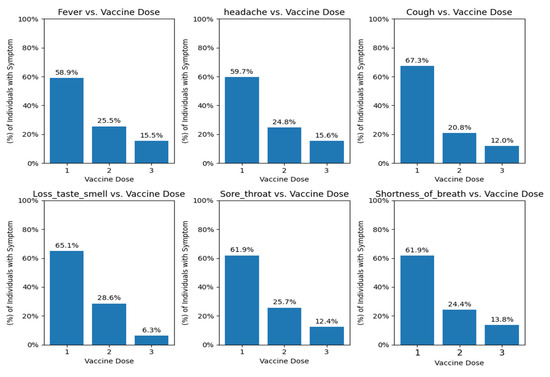 Severe cases may also arise from vaccine-related immune responses, such as Adult-Onset Still’s Disease (AOSD) [53,54] or cytokine storms [55,56], which can cause systemic inflammation and tissue damage. Our data suggest that 40% of hospitalized post-vaccination cases with a sore throat, accompanied by significant muscle and joint pain, can be indicative of AOSD. In some post-vaccination cases, severe symptoms like sore throat and joint pain may indicate AOSD, linked to an excessive inflammatory response triggered by the vaccine. Additionally, It is speculated that the vaccine, particularly in susceptible individuals, may induce excessive production of inflammatory cytokines storms that can lead to conditions like Polyserositis, causing pleural inflammation and fluid buildup, resulting in chest pain and difficulty breathing [57,58]. This highlights the need for personalized post-vaccination monitoring and potential additional booster doses to enhance vaccine effectiveness. Recent trends show fewer sore throat cases with increased vaccine doses (Figure 13) [59], aligning with studies linking vaccine side effects to efficacy [6,7,60,61,62]. This underscores the need to dive deeper into the occurrences of sore throat post-COVID-19 pandemic vaccination, recognizing that further data in this area could greatly benefit and enhance our knowledge. It is essential to emphasize the importance of more comprehensive data to supplement our existing framework despite the inherent biases in self-reported symptoms. As we transition beyond the COVID-19 pandemic, understanding vaccine efficacy and immune response to the virus becomes increasingly crucial. The continual collection and dissemination of reliable data among public entities and researchers remain vital in this context. Alongside advancing our comprehension of symptomatology in diagnosing the disease, the potential integration of new symptoms into forthcoming models should also be considered.