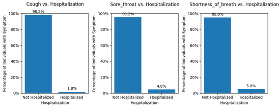 To better understand the ~5% of cases involving sore throat during hospitalization, we examined active symptoms and observed that 4 out of 5 individuals with a sore throat also had shortness of breath. The combination of sore throat and shortness of breath in these four cases that led to hospitalization suggests a severe respiratory tract issue that obstructs airflow, hindering and restricting breathing. This suggests that sore throat cases were part of more significant respiratory problems due to compromised immune systems, which is common in COVID-19 infections (Figure S6) [48]. This indicates a compromised immune system [49], as researchers have found that sore throat is the most common ear, nose, and throat symptom in COVID-19 [50]. When the immune system is weakened or overwhelmed by a viral infection like COVID-19 or as a side effect of the COVID-19 vaccine [40], it becomes less effective in fighting off pathogens and preventing the progression of respiratory symptoms. A sore throat typically occurs due to inflammation and irritation in the throat [51], which can be caused by viral or bacterial infections. Shortness of breath, on the other hand, is a sign of respiratory distress that often results from mucus or fluid buildup in the lungs or airway constriction [52]. The combination and complication of these two symptoms suggest that the immune system is struggling to control the COVID-19 infection, leading to the development of more severe respiratory issues. As the immune system’s defenses are compromised, the body becomes more susceptible to complications and potentially respiratory failure.