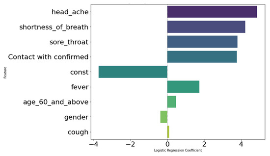 Our logistic regression model particularly underscores the importance of “Sore Throat” as a critical predictor, validating the broader analysis and comparison with the combination of all interpretation methodologies. The high coefficient for “Sore Throat” in the logistic regression model confirms its significance, as indicated by the other methods. The consistent appearance of “Sore Throat” in the top four features across various methods further supports its importance. This convergence of results strengthens our confidence in the validity of our methods and demonstrates that our predictive model accurately reflects the true relationships within the data. This validation contributes to our confidence in the significance of “Sore Throat” in our predictive analysis task, both for COVID-19 test outcomes and as an indicator of an immune response to the virus. A deeper analysis reveals that recent studies have identified sore throat not only as a predictor of COVID-19 test outcomes but also as a crucial indicator of an active immune response to COVID-19 [38,39].