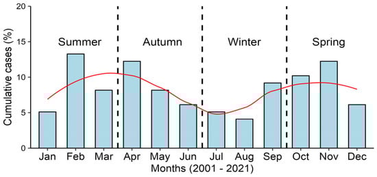 Cumulative cases (%) of NPEV-positive cases in the AFP/Poliomyelitis Surveillance Program by month during 2001–2021.