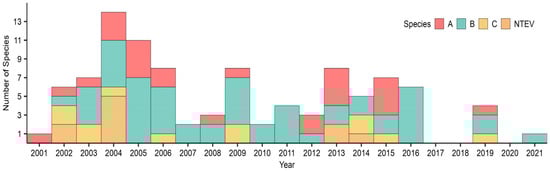 Distribution of EV-A, EV-B, and EV-C species, from 2001 to 2021. NTEV: not type EV.