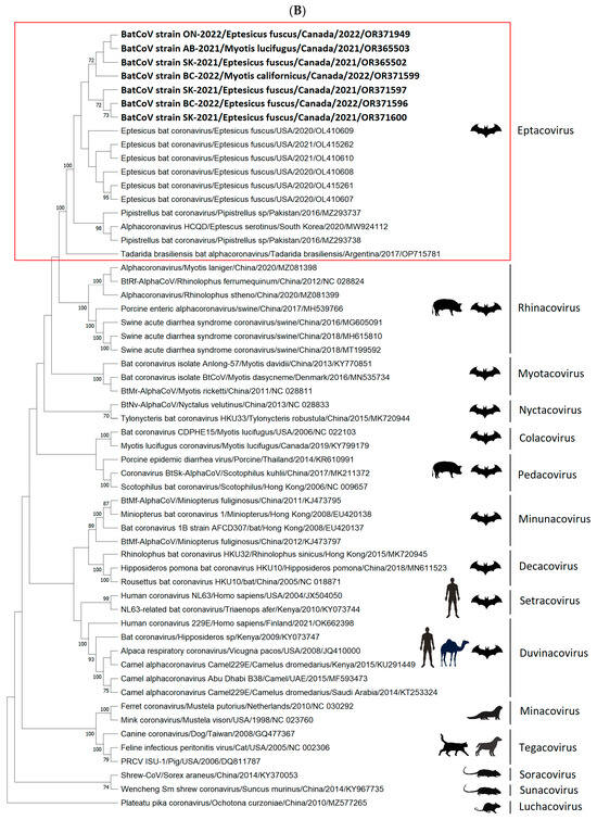 The phylogenetic analysis based on the partial genome sequences of CoVs (260 bp to 547 bp) confirmed the clustering of the CoV sequences in four distinct groups, including Alpha-CoV, Beta-CoV, Delta-CoV, and Gamma-CoV (Figure 3A). The group Alpha-CoVs is further divided into 14 known CoV species, classified as Sunacovirus, Soracovirus, Minacovirus, Tegacovirus, Rhinacovirus, Luchacovirus, Myotacovirus, Decacovirus, Minunacovirus, Nyctacovirus, Setracovirus, Duvinacovirus, Pedacovirus, and Colacovirus. Interestingly, the sequences obtained from the seven positive Canadian bat samples (three species) in this study formed an unclassified subgenus with other bat CoVs from the USA, Pakistan, South Korea, and Argentina and, as a result, are provisionally named Eptacovirus (Figure 3B).