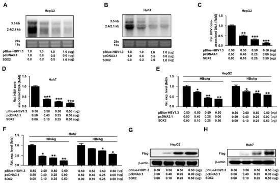 SOX2 represses HBV replication in HepG2 cells and Huh7 cells: (A–H) HepG2 cells (A,C,E,G) and Huh7 cells (B,D,F,H) were plated in 6-well plates and then co-transfected with pBlue-HBV1.3 and pcDNA3.1 or pcDNA3.1-SOX2 at different concentrations for 48 h. Total RNA was extracted and HBV RNAs were determined by Northern blot. The 28s and 18s rRNAs were used as the internal controls (A,B). HBV core-associated DNA was extracted and detected by qRT-PCR (C,D). HBsAg and HBeAg in cell culture supernatant were analyzed by ELISA (E,F). SOX2 and β-actin were detected by Western blot (G,H). *, p < 0.05, **, p < 0.01 and ***, p < 0.001.