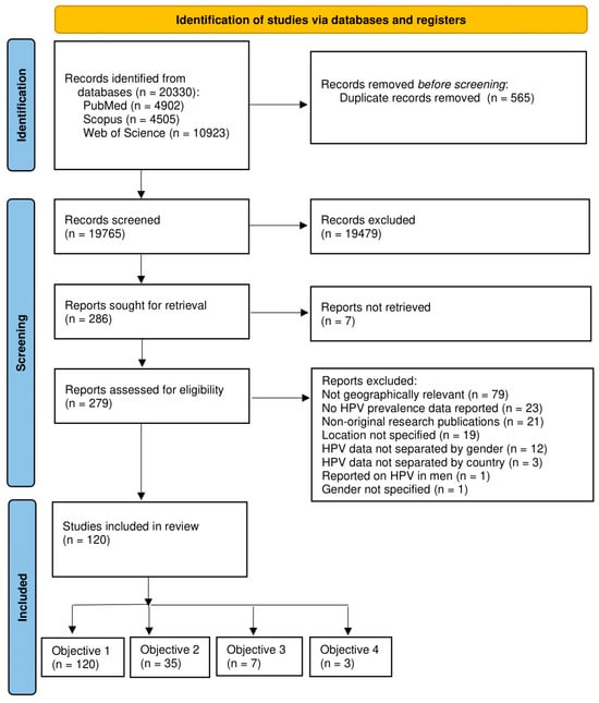 The articles were thoroughly analysed and grouped into four objectives as follows: (Objective 1) articles were included to determine the prevalence and distribution of HPV genotypes in South African women; (Objective 2) articles were included to assess the prevalence of HPV genotypes based on HIV status in South African women; (Objective 3) articles were included to examine the cervicovaginal microbiota composition and its correlation with HPV in South African women; and (Objective 4) articles were included to investigate the cytokine profiles associated with HPV in South African women (Figure 1).