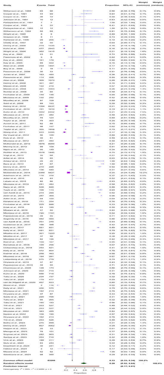 The overall prevalence of HPV infection in South African women, as reported in the included studies, was assessed irrespective of HIV status and sample type (Figure 2). Using the fixed-effects model, the pooled HPV prevalence was estimated at 33% (95% CI: 33–34%). However, due to the significant variability across studies, the random-effects model, which accounts for differences between studies, provides a more reliable estimate of 58% (95% CI: 52–64%). The heterogeneity among the studies was substantial, with an I2 of 99.1% and τ2 = 0.9489 (p < 0.001), indicating that the variation in HPV prevalence across studies was not due to chance, but likely reflects differences in study populations and methodologies. This high level of heterogeneity justifies the use of the random-effects model to accurately summarise the true burden of HPV in this population.