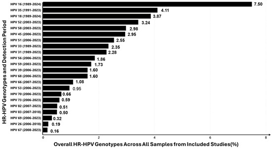 Overall prevalence (%) of HR-HPV genotypes detected in studies conducted from 1989 to 2024.