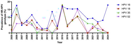 Over the observed period from 2005 to 2024, the prevalence of high-risk (HR) HPV genotypes 16, 18, 35, and 52 showed significant variability (Figure 5). These findings highlight the persistence of HPV-16 as the most prevalent type, with fluctuations in the detection rates of HPV-18, 35, and 52 over time. HPV-16 consistently exhibited the highest detection rates, maintaining a strong presence throughout the years from 2005 to 2024. Similarly, HPV-18 had high detection rates during this period, while HPV-35 showed sporadic detections and HPV-52 was only detected from 2006 onwards. Notably, from 2015, HPV-35 had higher detection rates than HPV-18, with both genotypes showing varying levels of detection, each peaking in different periods but generally remaining within the 0–20% range. HPV-52, among the other genotypes, had lower detection rates but remained relatively consistent throughout the observed period. The peaks in 2015 for all four HPV types may indicate a period of increasing detection or prevalence, possibly reflecting improvements in testing or diagnostic methods. However, there were years, such as 2013 and 2020, in which one or more HPV genotypes were not detected, suggesting potential changes in diagnostic capabilities or shifts in research focus.