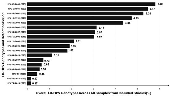 Overall prevalence (%) of LR-HPV genotypes detected in studies conducted from 1996 to 2023.
