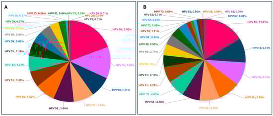 Distribution and prevalence of HR-HPV genotypes among HIV-negative (A) and HIV-positive (B) women. The pie charts represent the percentage prevalence of each HR-HPV genotype within each group.
