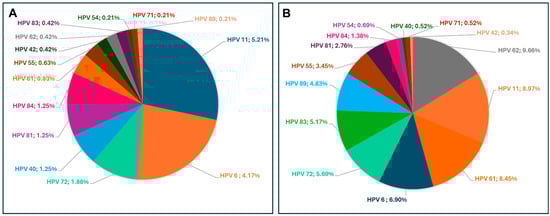 Distribution of LR-HPV genotypes among HIV-negative (A) and HIV-positive (B) women. The pie charts represent the percentage prevalence of each LR-HPV genotype within each group.