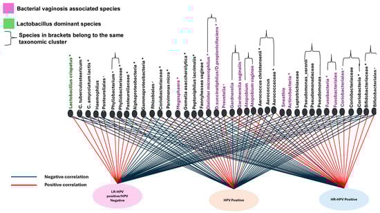 Network analysis of cervicovaginal microbiota composition correlated with HPV infection status. Negative correlations are displayed in blue, while positive correlations are in red. Bacterial species associated with bacterial vaginosis (BV) are shown in purple, Lactobacillus-dominated species are in green, and those bacterial species with association not clearly indicated are shown in black. Taxonomic clusters indicate groups of taxa sharing the same hierarchical classification levels, denoting biological relatedness. Bacterial taxa significantly associated with each HPV category are marked with an asterisk above the species name.
