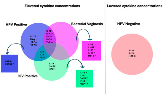Venn diagrams illustrating elevated cytokine concentrations in women with HPV infection, HIV infection, and bacterial vaginosis (BV) and lowered cytokines in HPV-negative women. The cytokines significantly associated with each category are indicated by the asterisk.