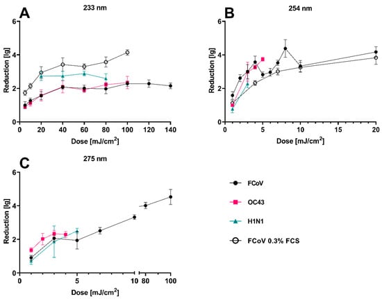 The inactivation kinetics of FCoV, HCoV, and H1N1 using UV-C radiation on steel carriers were studied with all three wavelengths (233 nm, 254 nm, 275 nm, Figure 2). With higher doses, the inactivation increased. The required 4 lg inactivation [] was not achieved for all three viruses using 233 nm radiation with a maximum dose of 140 mJ/cm2. Application of 254 nm UV-C radiation resulted in 4 lg inactivation for FCoV using a dose of 8 mJ/cm2. Using 275 nm radiation, a 4 lg inactivation was achieved for FCoV after an application of 80 mJ/cm2.