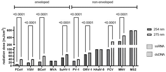 Significantly higher minimal radiation doses were necessary to achieve an effective inactivation of 4 lg with the 275 nm radiator compared to the 254 nm mercury lamp (Figure 3, Supplementary Tables S2 and S3) for most of the tested viruses (p < 0.0001). Only HAdV-5, MVA, and MS2 required comparable radiation doses for effective inactivation with both wavelengths. With regard to the genome, no discernible difference could be observed between double-stranded and single-stranded or RNA or DNA viruses. Differences due to the carrier material were not observed (Supplementary Tables S3–S5).