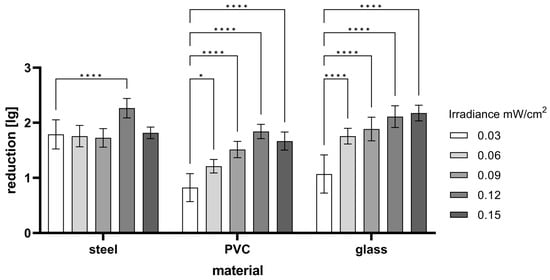 Effect of irradiance on virus inactivation (FCoV) on different materials when applying 20 mJ/cm2 (233 nm), with different irradiances resulting in different treatment times. Weighted mean ± internal/external consistency. * p < 0.05, **** p < 0.0001.