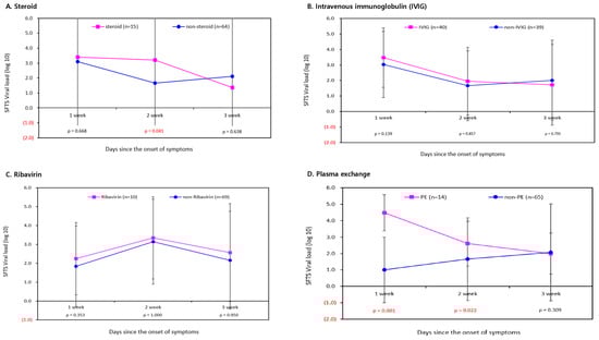 10 RNA copies/reaction at 1, 2, and 3 weeks after symptom onset, respectively. These results are similar to those obtained with steroid treatment. In the case of PE treatment, a statistically significantly higher SFTS viral load was found in patients treated with PE than in patients not treated with PE between 1 and 2 weeks since onset of symptoms (