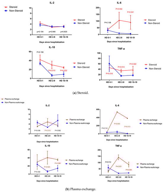 Among patients who underwent PE, IL-2 was 3.05 (0.22), 4.90 (1.38) and 3.45 (0.58) at HD 0–1, HD 2–9, and HD 10–19. IL-6 was 37.70 (11.31), 535.86 (10.97) and 381.90 (1.80), IL-10 was 29.91 (18.02), 40.60 (16.08) and 35.50 (1.99), and TNF-α was 29.61 (5.82), 141.53 (19.56) and 84.15 (19.73), respectively. In patients who did not undergo PE, IL-2 was 4.61 (0.71), 2.68 (0.09) and 5.46 (2.36) in HD 0–1, HD 2–9 and HD 10–19. IL-6 was 33.15 (12.32), 44.57 (24.44) and 6.78 (1.58), IL-10 was 24.13 (4.50), 6.53 (2.13) and 14.37 (7.13), and TNF-α was 59.11 (20.93), 14.80 (2.10) and 17.32 (2.56) (